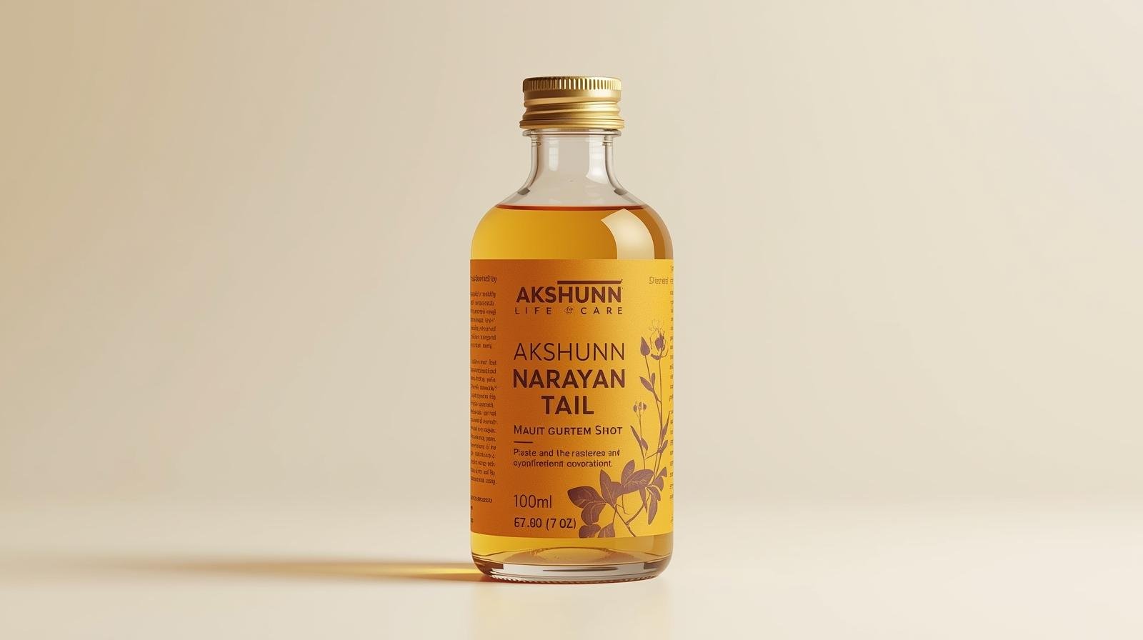 Akshunn Narayan Tail manufactured by Akshunn Life Care is a premium Ayurvedic medicated oil prepared using traditional herbal knowledge combined with modern manufacturing standards. This classical Ayurvedic oil is formulated with a powerful blend of carefully selected herbs processed in a high-quality base oil to provide natural support for joint comfort, muscle relaxation, and overall body wellness. Prepared under strict quality control and hygienic conditions, Akshunn Narayan Tail reflects purity, safety, and authenticity in every bottle.